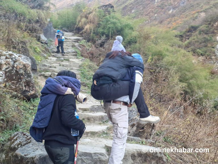 With help from the hotel staff, the woman was carried overnight to Sinuwa. “She regained consciousness after reaching Sinuwa,” said rescuer Uttam Shrestha.