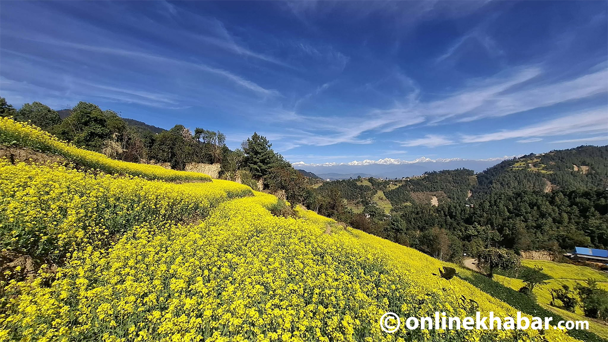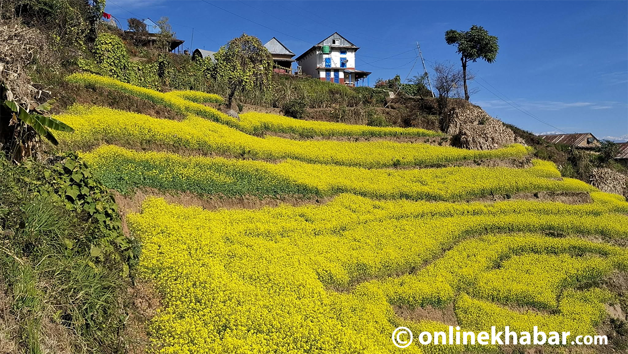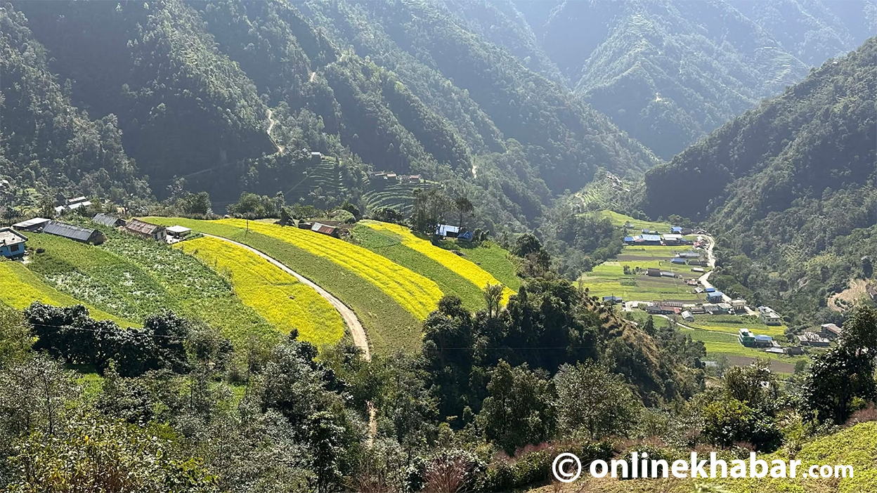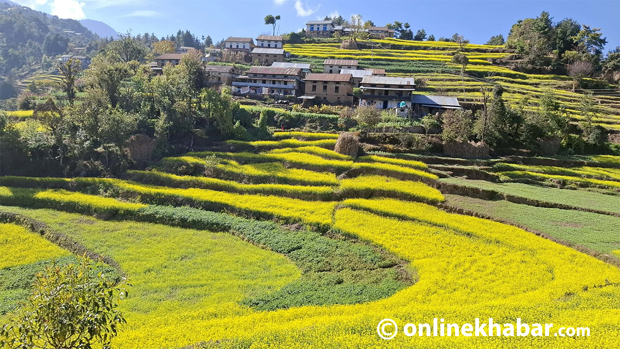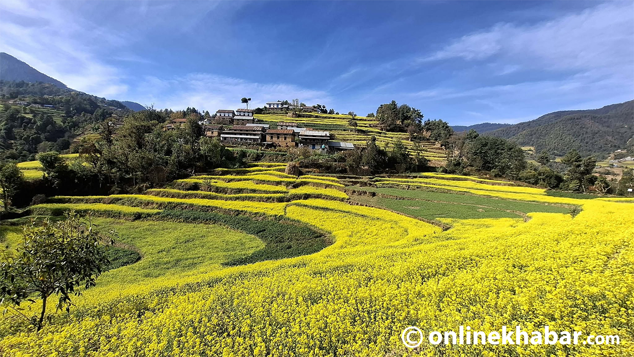 In the areas of Dhunkhark, Gairi bhanjyang, Chyamrangbesi, and Gumwadanda, located at the foothills of Bethanchowk Narayan and Gajaram Mountain, the farmlands have turned yellow with blooming mustard flowers. The terraces and fields here, covered with mustard crops, are now fully blanketed in yellow.