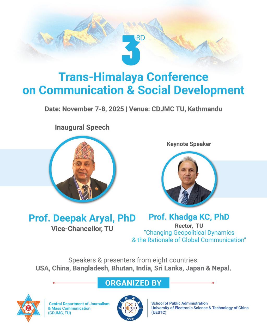 The 3rd Trans-Himalaya Communication Conference on Communication and Social Development, jointly organized by the Central Department of Journalism and Mass Communication (CDJMC), Tribhuvan University (TU), and the School of Public Administration, University of Electronic Science and Technology of China will be held on November 7–8 at the Camera Building CDJMC TU.