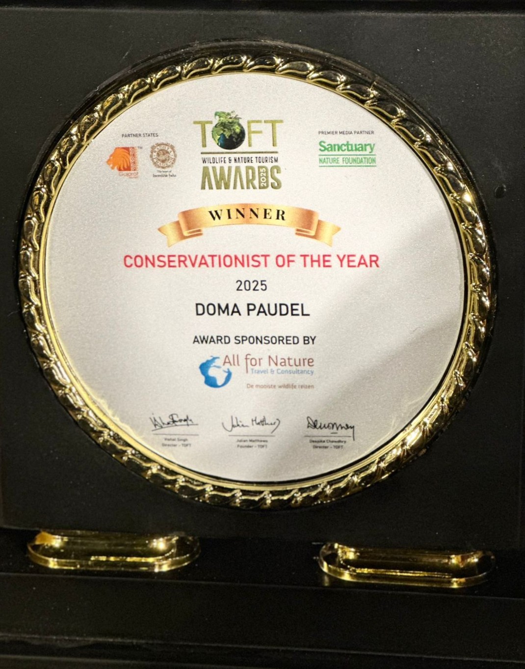 Doma Paudel, founder and chief executive officer of Nepal Dynamic Eco Tours (NDET) and the Wildlife Victim Fund, has been awarded the prestigious TOFT “Conservationist of the Year 2025”.