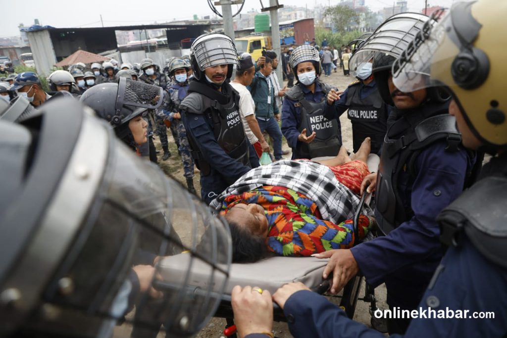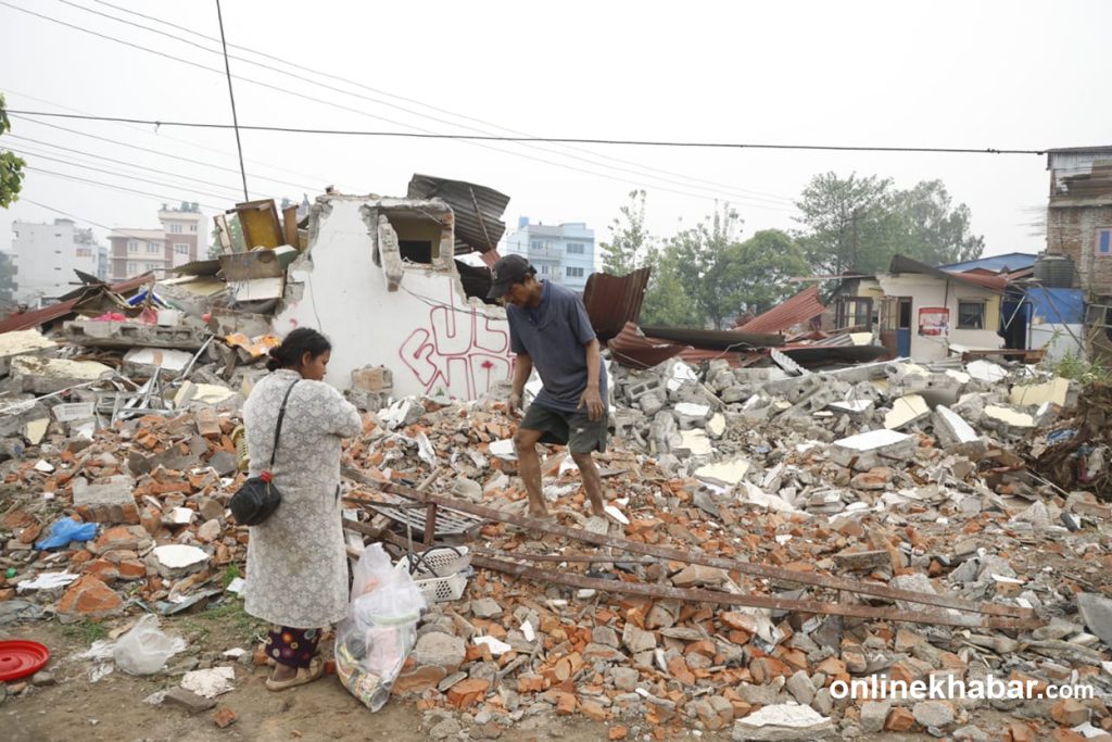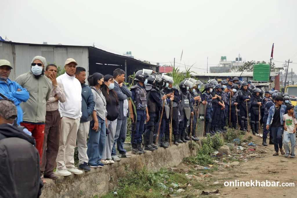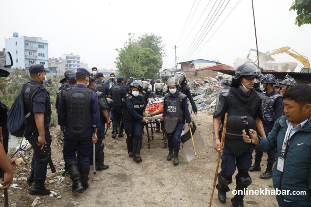A team from Kathmandu Metropolitan City, under heavy police security, is demolishing homes in the squatter settlement along the Manohara River bank.