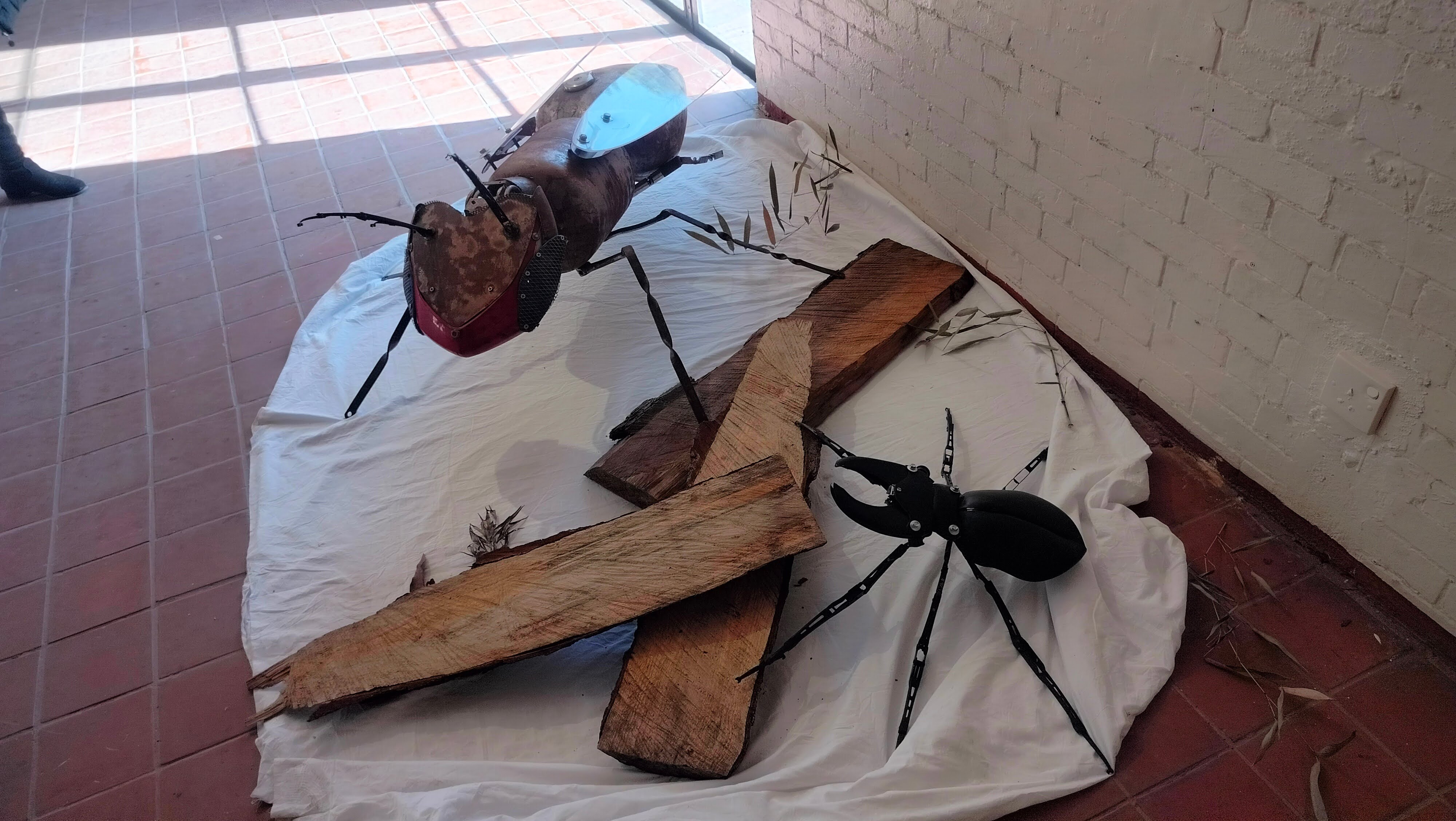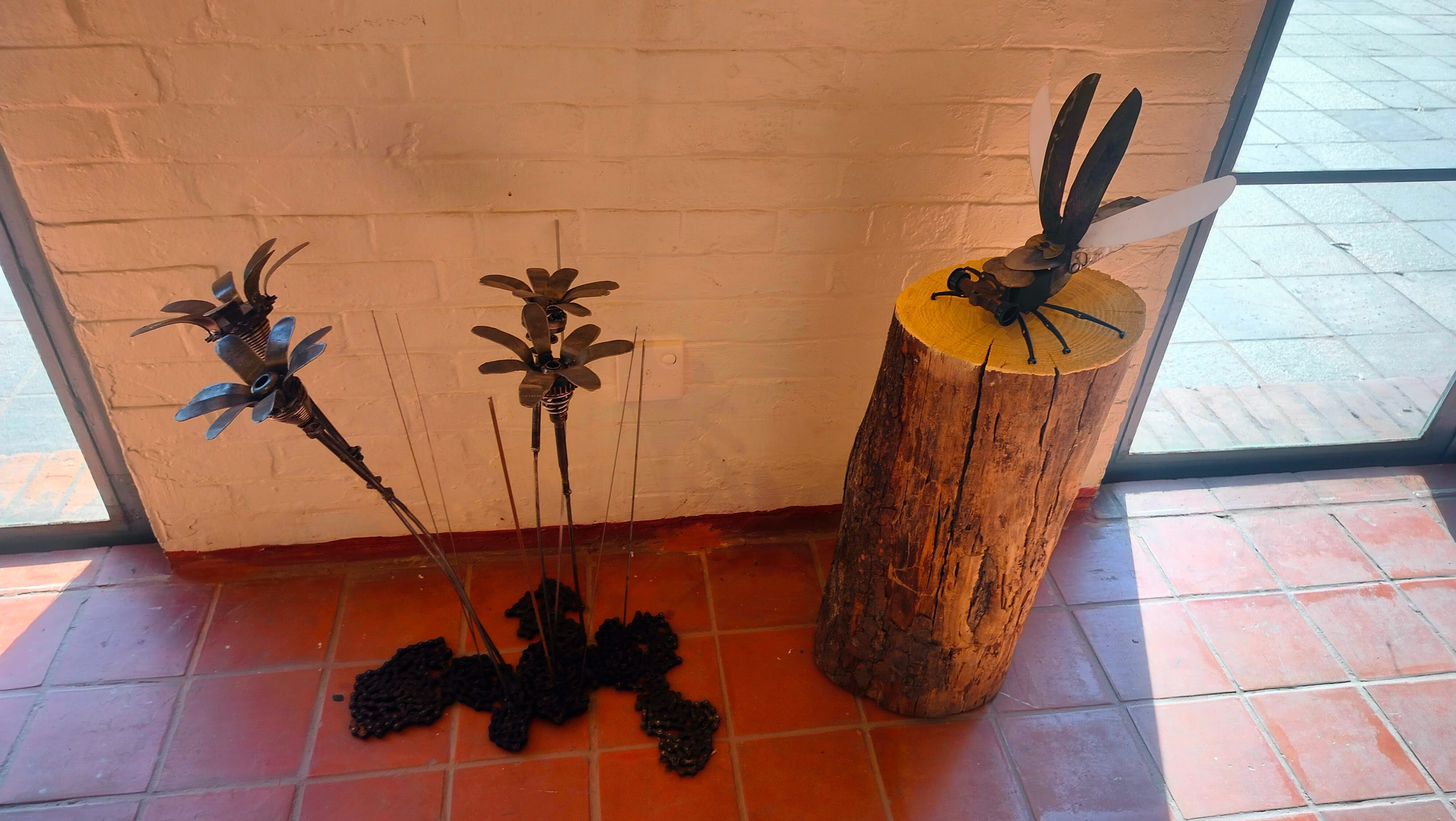 Likewise, there is a battle between the queen wasp and the ant. The wasp is running after the little ant who has stolen her babies. With the placement of the wasp comb and a few dried leaves, sculptures made of rusty, ignored junk magically come alive.