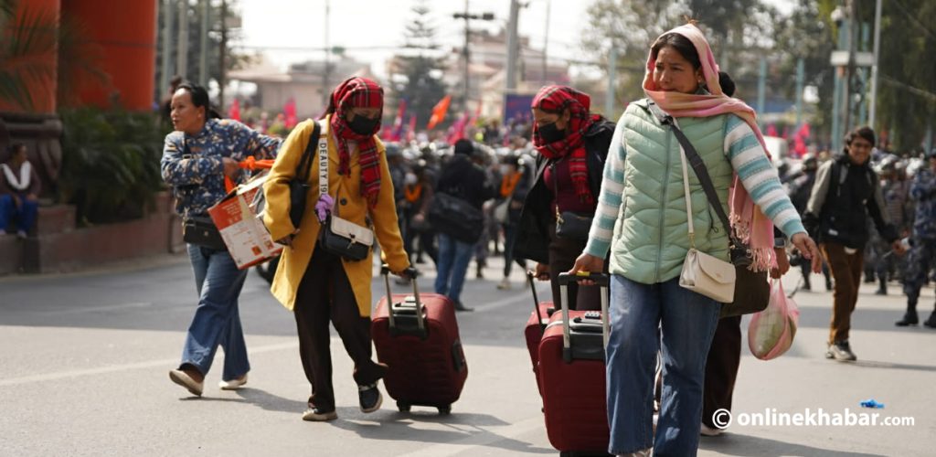 A large number of royalist supporters have gathered around the airport premises, creating problems for travellers. Many passengers were seen hurriedly dragging their suitcases through the airport gate to enter the terminal.