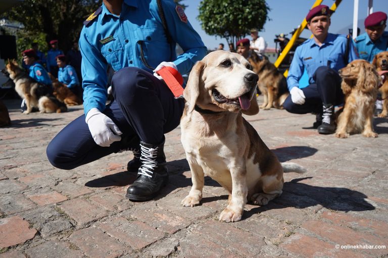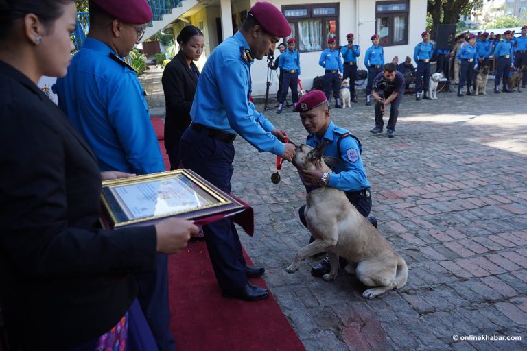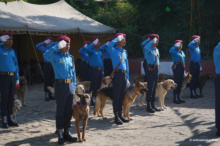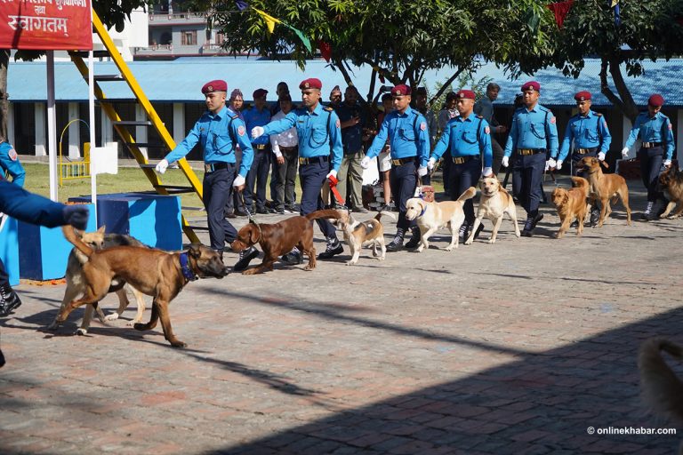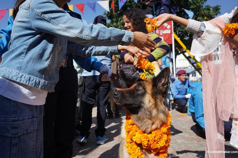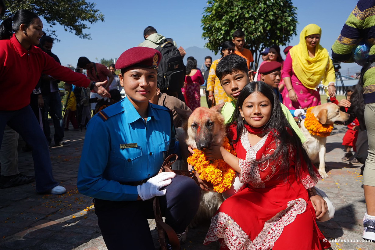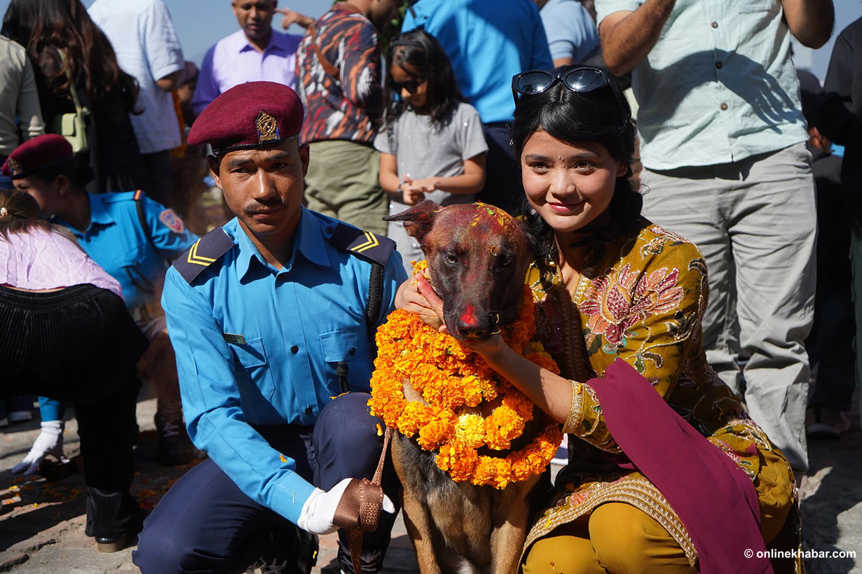 Nepal Police celebrated Kukur Tihar on Monday by worshipping its trained dogs at the Canine Office in Maharajgunj.