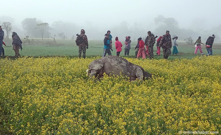 The rhino, believed to be six-seven years of age, was found dead on Mohan Lal Panthi’s farm in Kawasoti-10 on Sunday morning, Kawasoti Munuicpality deputy mayor Prem Shanker Mardaniya told Onlinekhabar. “We are yet to ascertain the cause of the death,” Lamachaur Forest User Group’s chief Basudev Paudel said. Police have now cordoned off the area where the animal was found dead.