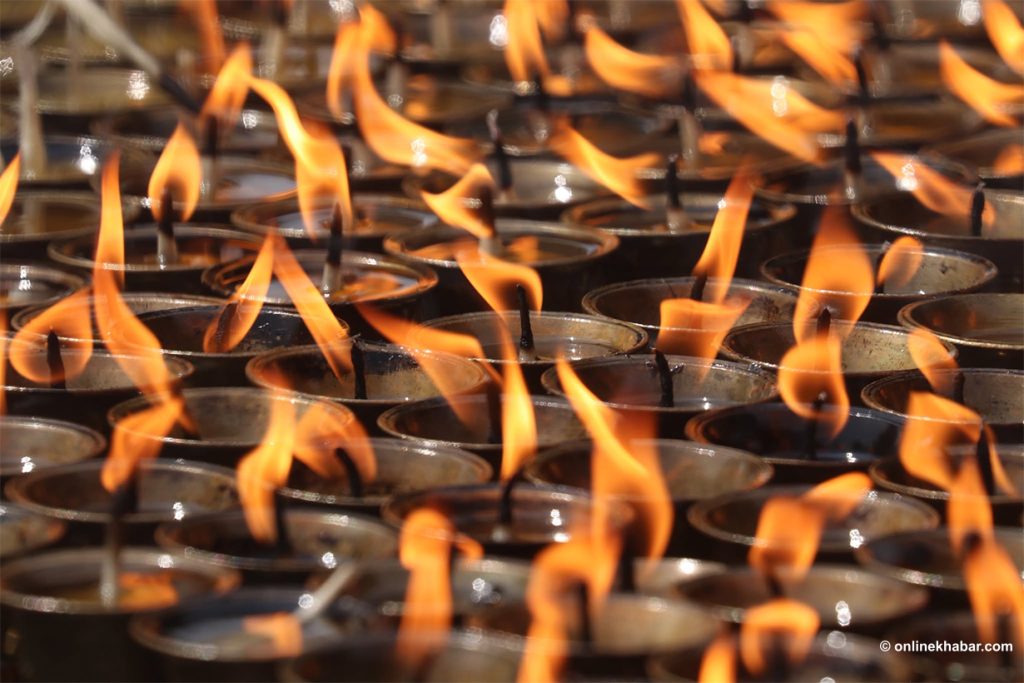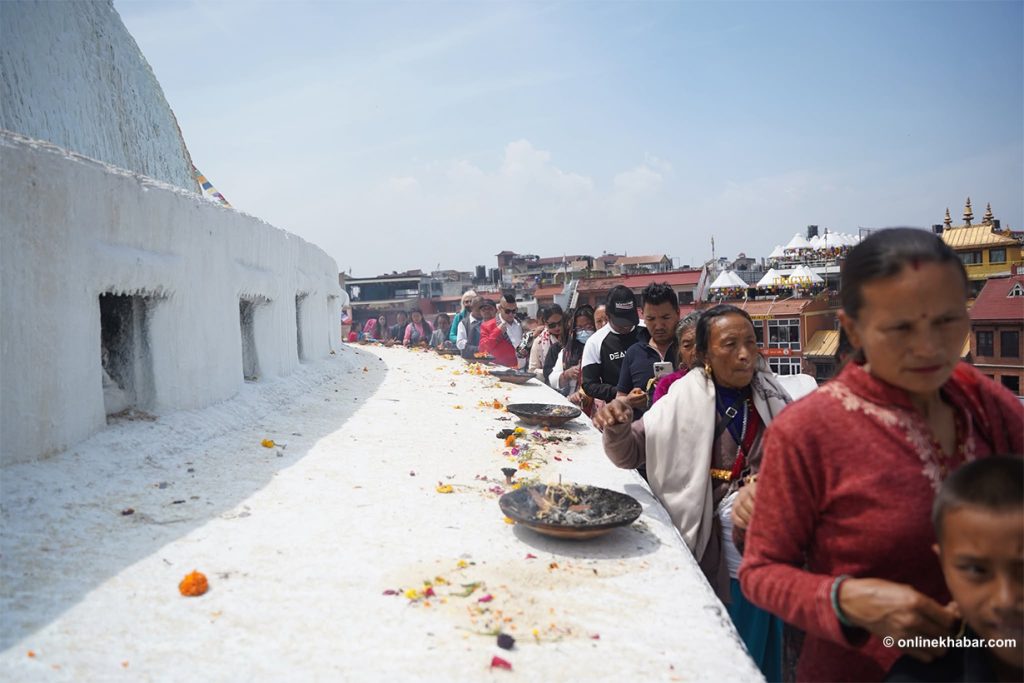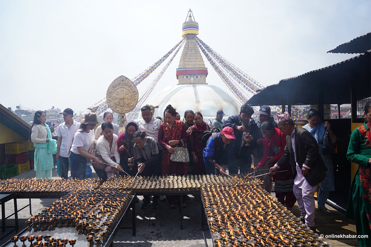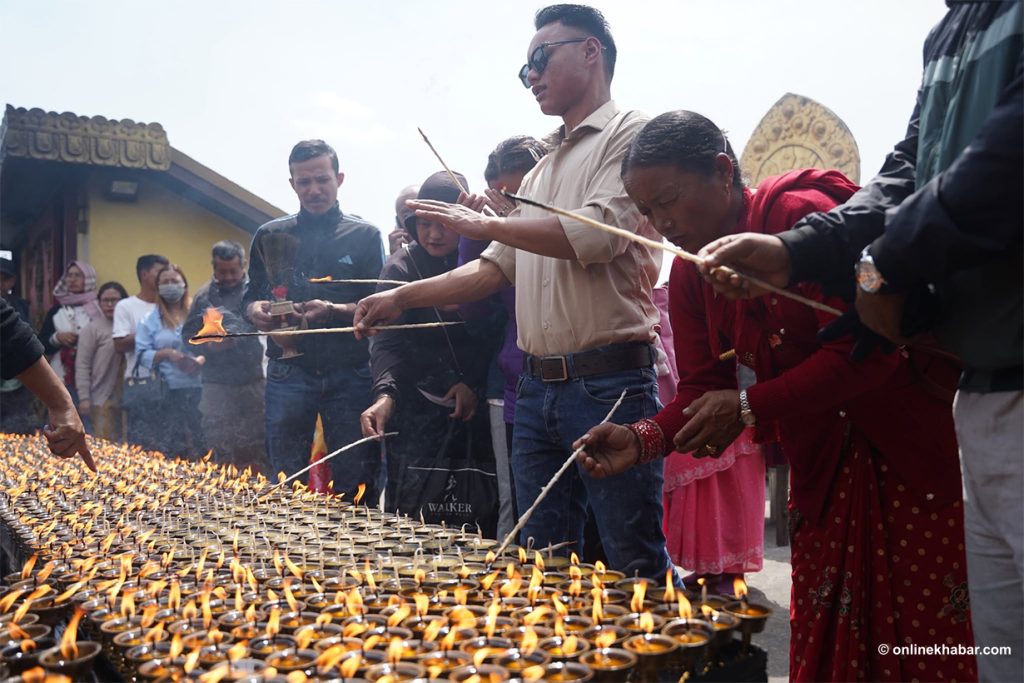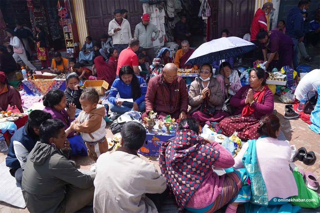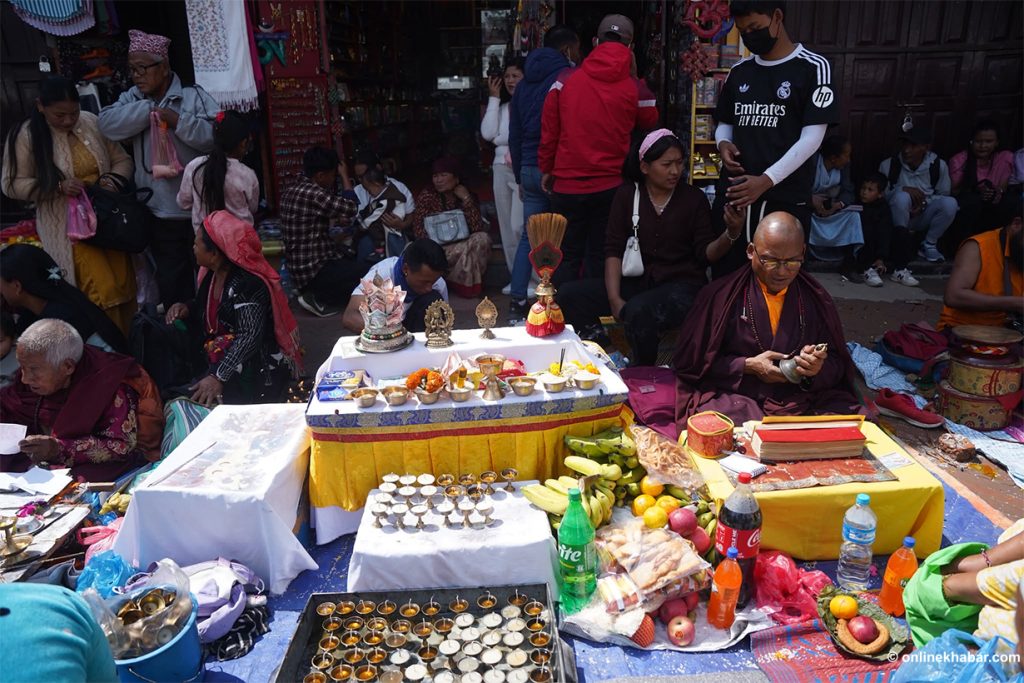 On Chaitra Shukla Chaturdashi, members of the Tamang community perform special prayers led by Lama gurus, wishing for peace for the departed souls. They also light butter lamps at the Bouddha Stupa as part of the ritual.
